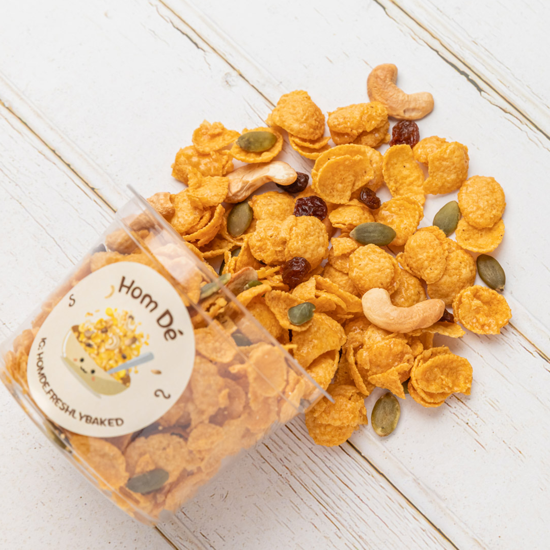 คอนร์เฟลคส์อบน้ำผึ้ง ตัวซอสน้ำผึ้งคาราเมลสูตรลับจากทางร้าน สีเหลืองหอมนวล หวานกลมกล่อม น้ำผึ้งเกสรดอกลำไยคัดพิเศษแท้100% พร้อมเมล็ดธัญพืช 3 ชนิด ลูกเกด,เมล็ดฟักทอง,เม็ดมะม่วงหิมพานต์